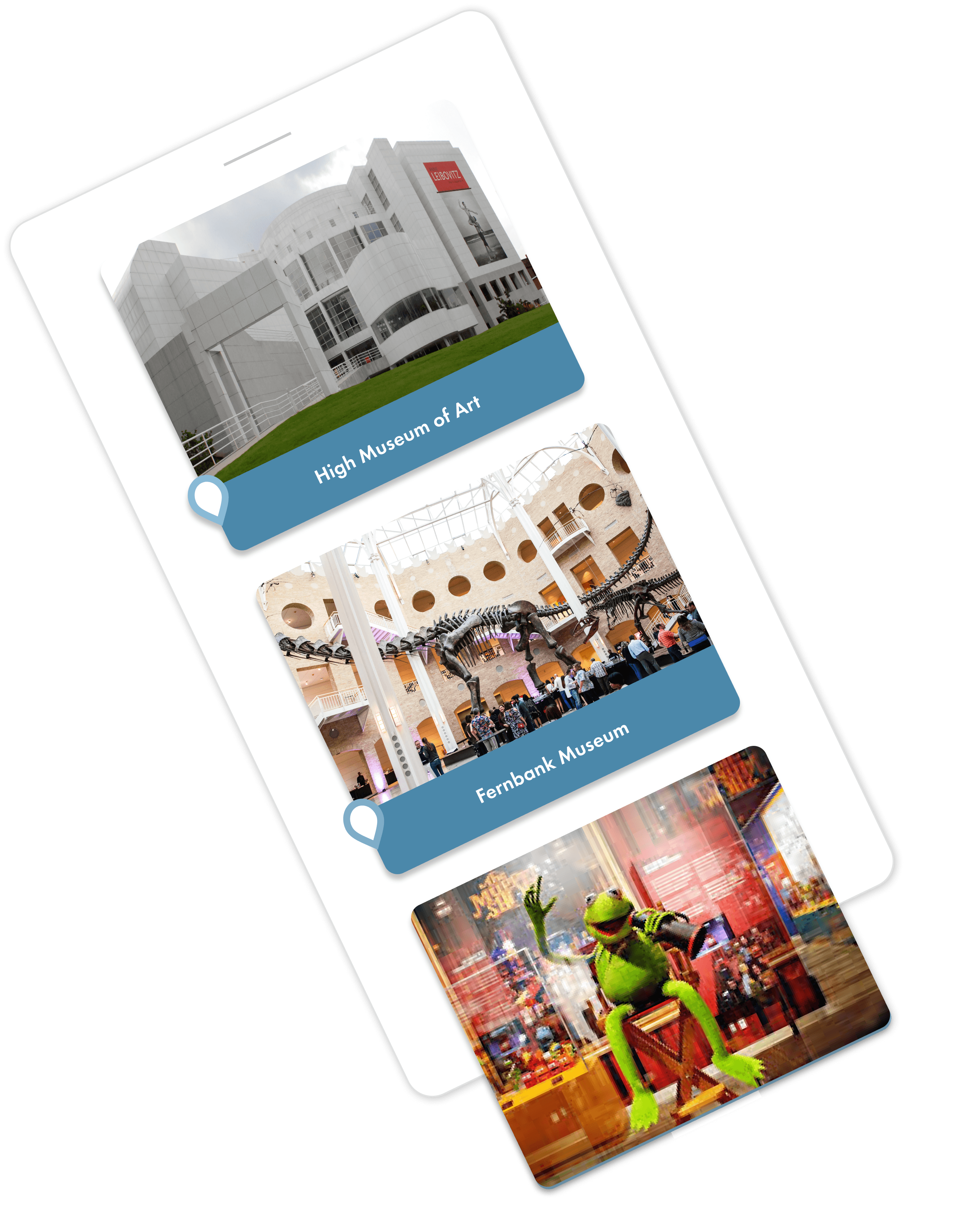 Users can tap on a pin, bringing up the card for that museum, or they can swipe to drag the list view up and select a museum card that way